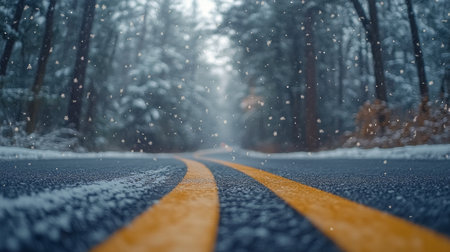 A quiet road stretches through a snow covered forest, with yellow lines visible on the asphalt. Snow falls gently, creating a serene winter atmosphere filled with fallen leaves.