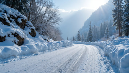 A serene winter scene featuring a road winding through a snowy forest with tall trees and a rugged hillside