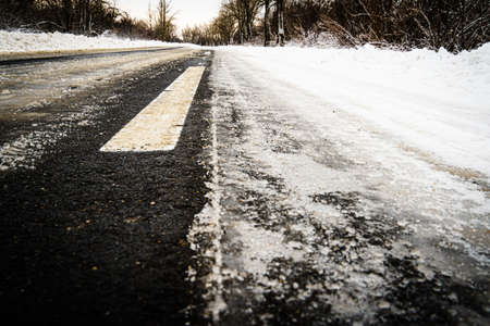 Road for traffic in winter, road markings under snow and ice