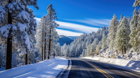An enticing vision of a winter road trip evoking future aspirations. Concept Winter Road Trip, Wanderlust, Snowy Adventures, Cozy Cabins, Scenic Views
