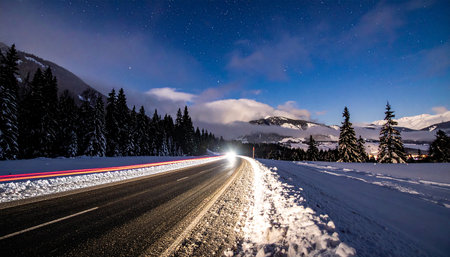 A snowy highway with car light trails streaking by like shooting stars adding a touch of excitement to the winter landscape