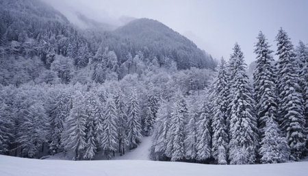 Majestic snow-covered mountain range with evergreen trees and fog-covered peaks