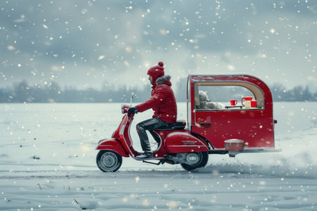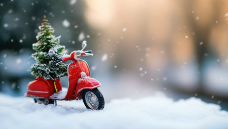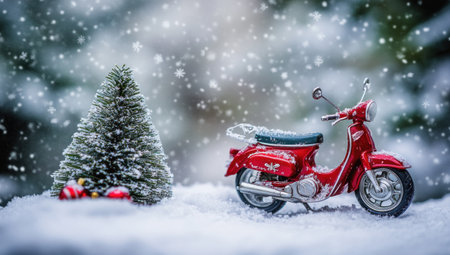 A cute little red motorcycle with a Christmas tree on the snow, macro photography, miniature landscape. --ar 53:30 --v 6.1 Job ID: 1f466a0f-f22a-4db5-96ef-5134cdcce0e3