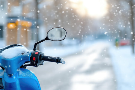 Blue electric scooter in snow in urban park for illustrating winter urban scenes, transportation, and weather conditions. Inclement weather, unexpected snowfall.