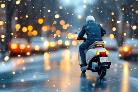 Person riding an electric scooter on a snowy city street, with festive lights and snowfall
