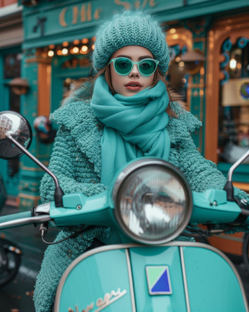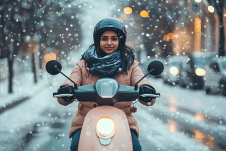 Indian woman confidently riding her electric scooter along a bustling city street in winter season