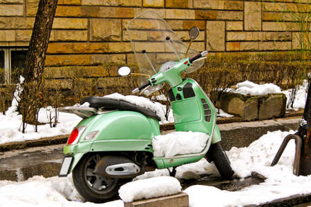 Bright green scooter covered with snow in winter