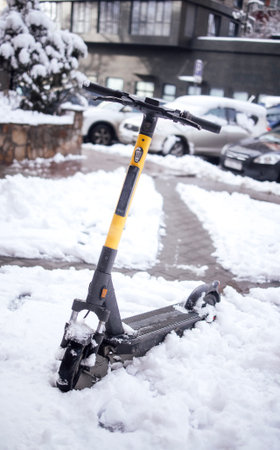 city electric scooter stands in the snow in winter