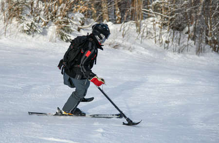 Adaptive Skiing with one leg : Disabled ski racer a three-tracker, or one-legged skier training kids how to ski at Stowe mountain resort