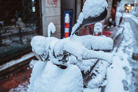 Scooter for rent covered in snow. Bad weather for riding a scooter. The end of the season of bicycles and scooters due to bad weather. strong wind and sleet