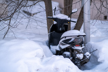Frozen moped overwinters under snow
