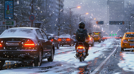 Delivery moped drives through heavy traffic. Snowy road.