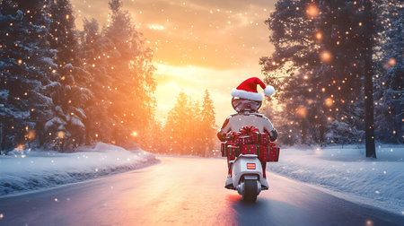 Robot with Santa Claus hat riding his scooter carrying gifts in winter forest and sunset in the background. Concept of technology, delivery, logistics, innovation and Christmas.
