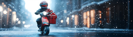 Robot riding his scooter carrying gifts on the street in the city. Concept of technology, delivery, logistics, innovation and Christmas.