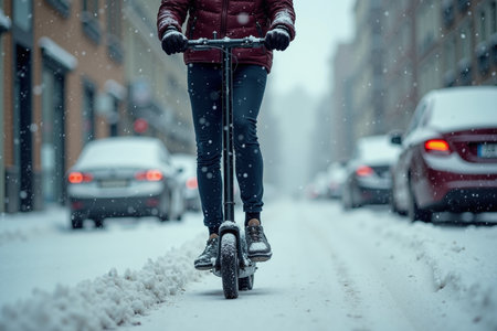 person riding an electric scooter down a snow-covered city street