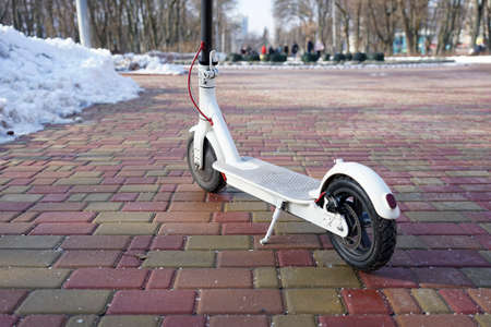 The electric scooter stands on the track in the park in the spring. There is snow all around
