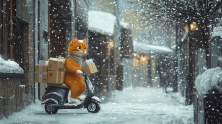 A whimsical, cute cat character delivers Christmas packages on a scooter through a snowy alley, creating a festive and heartwarming winter scene.