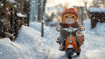A charming scene of an adorable cat riding a scooter through a snowy pathway, surrounded by falling snowflakes and festive gifts, evoking winter joy.