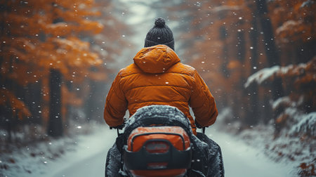 A person wearing an orange jacket is riding a bicycle down a snow covered path surrounded by trees. Snowflakes gently fall as autumn leaves create a contrast with the white snow.