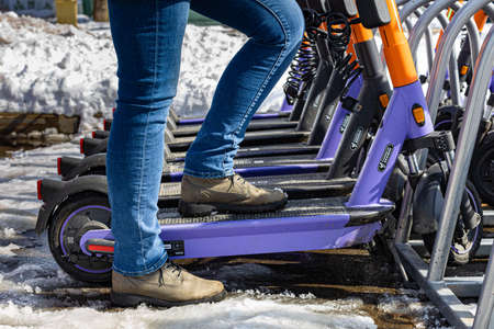 Moscow, Russia - April 04, 2022:a man stands on the platform of the scooter. high quality photo