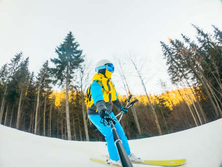 woman skier taking selfie while riding by slope copy space