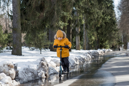 A little boy in bright yellow clothes rides a scooter. A happy child walks outside in early spring.