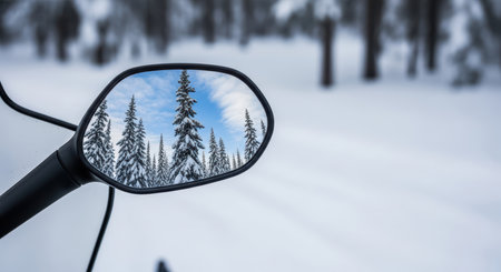 Winter wonderland reflected in car mirror with snowy pine trees
