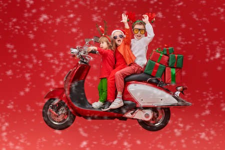 Three cheerful children ride a red scooter carrying gifts for Christmas and New Year. Festive red background with snowflakes.