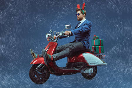 Christmas and New Year. Handsome man in elegant suit and deer horns sits on a red scooter with gifts on blue snow-covered background.