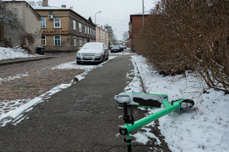 LATVIA, LIEPAJA - 7 JANUARY: Liepaja is a city in Latvia. View to the street in lockdown time with green scooter on 7 January 2020, Liepaja, Latvia.