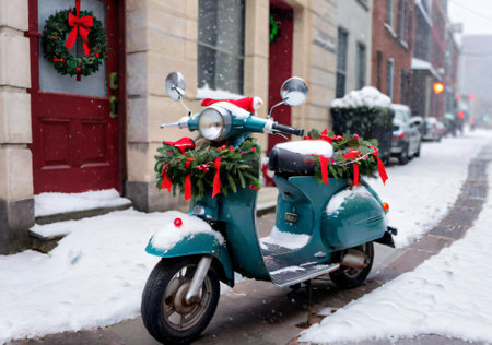 A Christmas Garland On A Vintage Scooter, Parked In A Snowy City Street. Generative AI