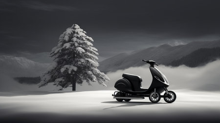 a minimalist monochromatic landscape featuring a sctv scooter in the snow, with a pine tree in the background. this photobashing style photograph captures the outlandish energy of the scene, with dark silver and black tones adding a touch of timeless grace. the curvilinear design of the scooter adds a unique element to the composition. ai generated