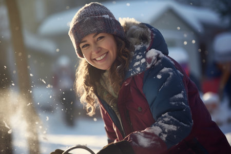 a woman shoveling snow in front of her house in the winter season bokeh style background