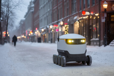A delivery robot travels along a snowy street in the city. Soft lights glow from its front as it navigates past shops and quiet pedestrians in a cozy winter setting.