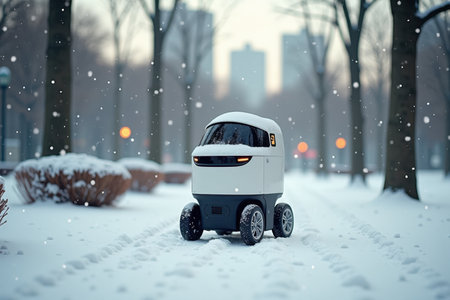 A small delivery robot navigates a snowy urban park, delivering packages. Snowflakes fall gently, and the park is surrounded by bare trees and distant city buildings.