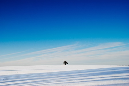 Tranquil snowy field under a clear blue sky, featuring a single bare tree in a minimalist winter scene