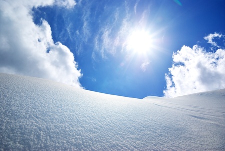 Abstract minimalistic winter landscape, snow covered hill with blue sky in background on sunny day, copy space included