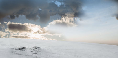 Panoramic view of the snow-covered field after a blizzard at sunset. Human tracks in a fresh snow. Ice desert. Dramatic cloudscape. Global warming theme. Lapland, Finland