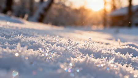 Snowflakes glistening as sunlight reflects on them, creating a stunning winter scene