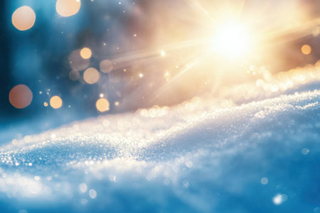 A snow-covered landscape with beams of sunlight creating sparkling reflections on the snow, evoking a sense of winter wonderland