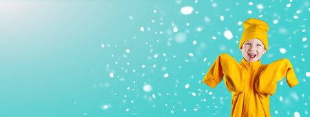 Outdoor winter portrait of little healthy happy baby child walking in the park on cold day with snow and snowfall. Stylish clothes for kids.