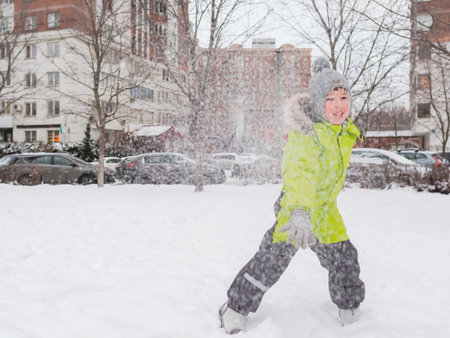 Laughing boy in green jumpsuit plays snowball on snowy yard among trees. Leisure activity for children in winter.