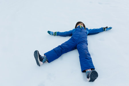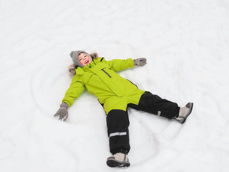 Laughing boy in green jumpsuit is making snow angel shape on snow. Joyful child playing outdoors in snowy weather. Top view on happy kid in colorful overall suit.