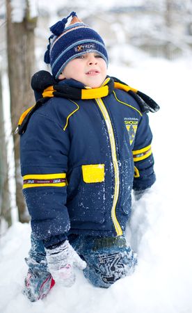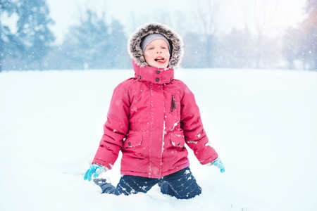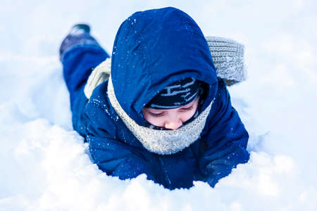 Boy playing in big snow in winter. Happy caucasian child playing in snow.