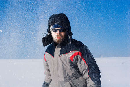 A man in a winter hat and a fur coat in blue sunglasses on the street is snowing
