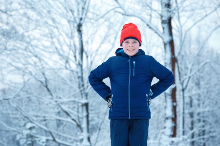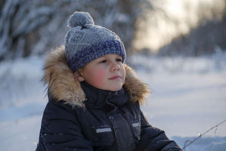 Portrait of a beautiful little Russian boy in winter in the park. Snow is falling. Cold. Red cheeks. The concept of a happy childhood and remedies for the skin from frost.