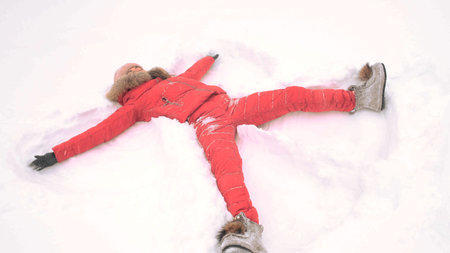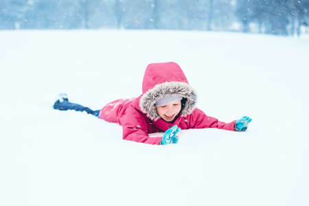 Cute adorable Caucasian girl child in warm clothes red jacket lying on snow ground during cold winter snowy day. Kids outdoor seasonal activity. Child making snow angel. Banner header for website.