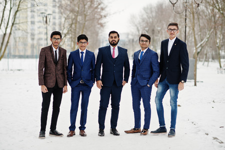 Group of five indian businessman in suits posed outdoor in winter day at Europe.
