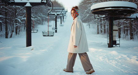 A young woman in a white coat and a red headscarf walks in the winter park.