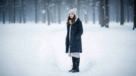 A solitary woman stands in a quiet, snow-covered forest, dressed in a warm winter coat, knit hat, and boots. Soft snowfall and muted tones create a peaceful, contemplative atmosphere. Perfect for themes of winter lifestyle, solitude, mindfulness, cold-weather fashion, nature, and seasonal mood imagery.